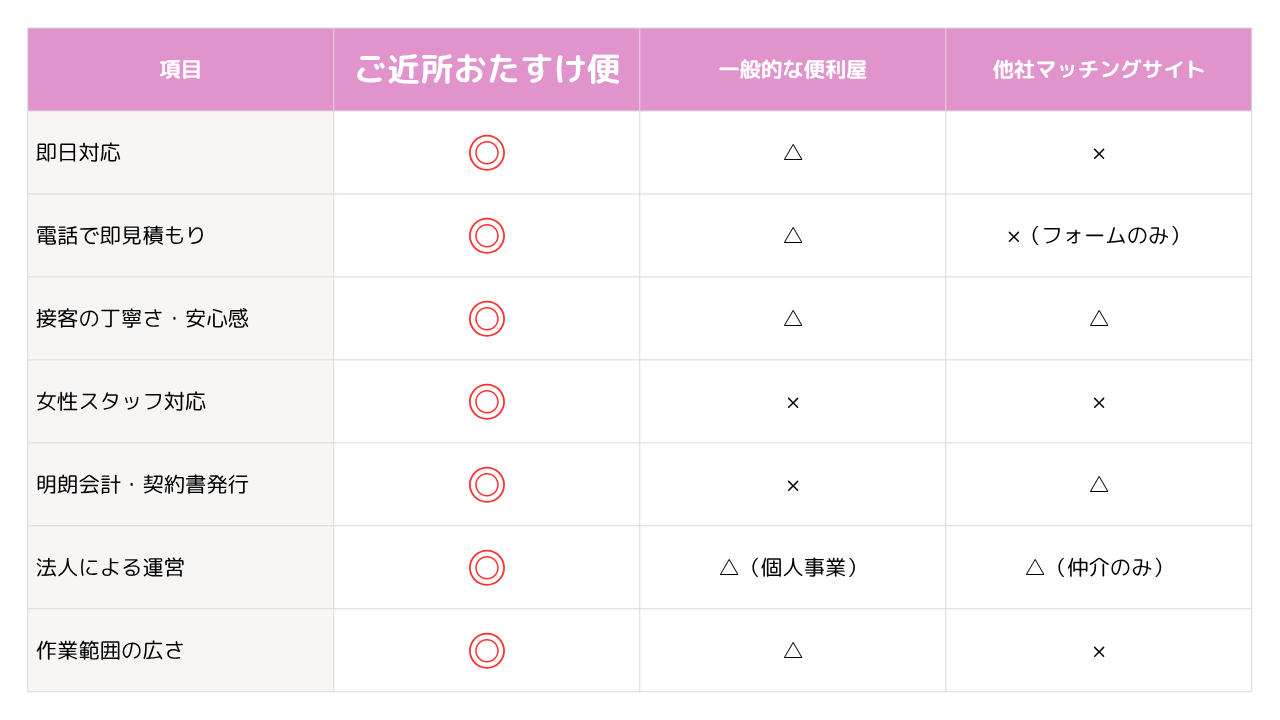 正直なところ、特定ジャンルに特化した専門業者(例:引越し専門業者様や不用品回収専門業者様など)に比べると専門性が劣る場合があるのも事実です。しかしその分、対応スピード、柔軟なサービス内容、明るく優しいスタッフの人柄でご満足いただける体制を整えております。